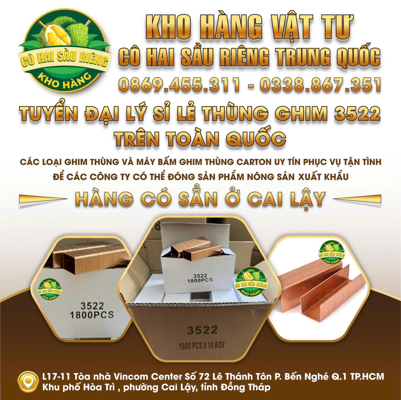 Cô Hai Sầu Riêng Trung Quốc là đơn vị tiên phong trong việc cung cấp vật tư nông sản chất lượng cao như: thùng, tem, sọt cần xé, pallet, dây đai, ghim 3522... và giải pháp canh tác chuyên biệt cho sầu riêng xuất khẩu sang Trung Quốc.
